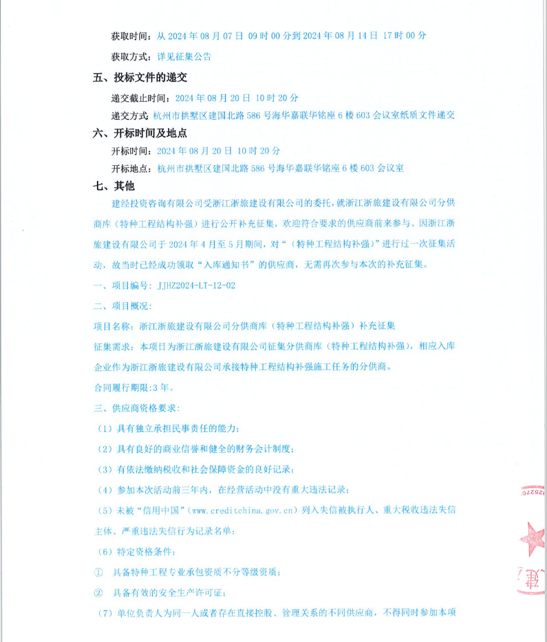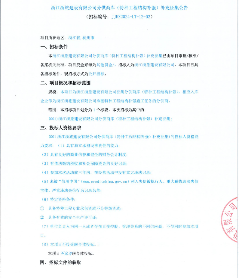 浙江浙旅建设有限公司分供商库(特种工程结构补强)补充征集公告