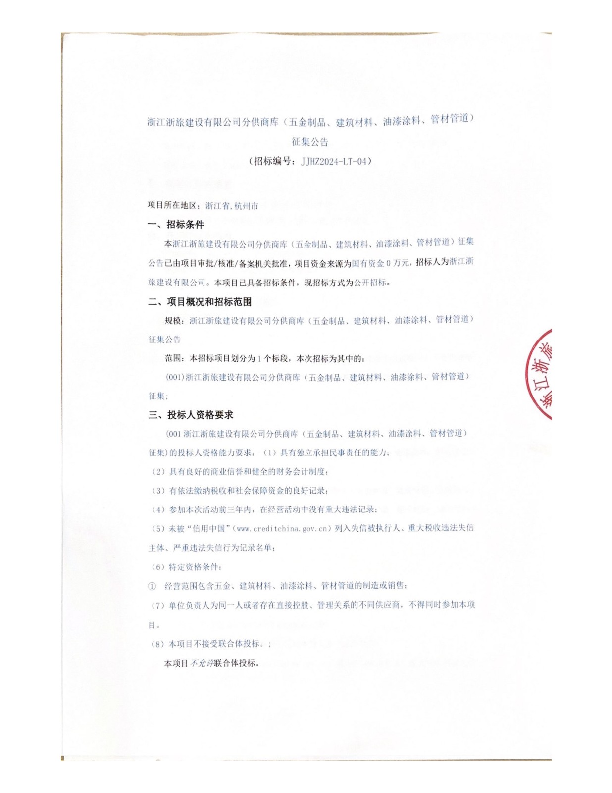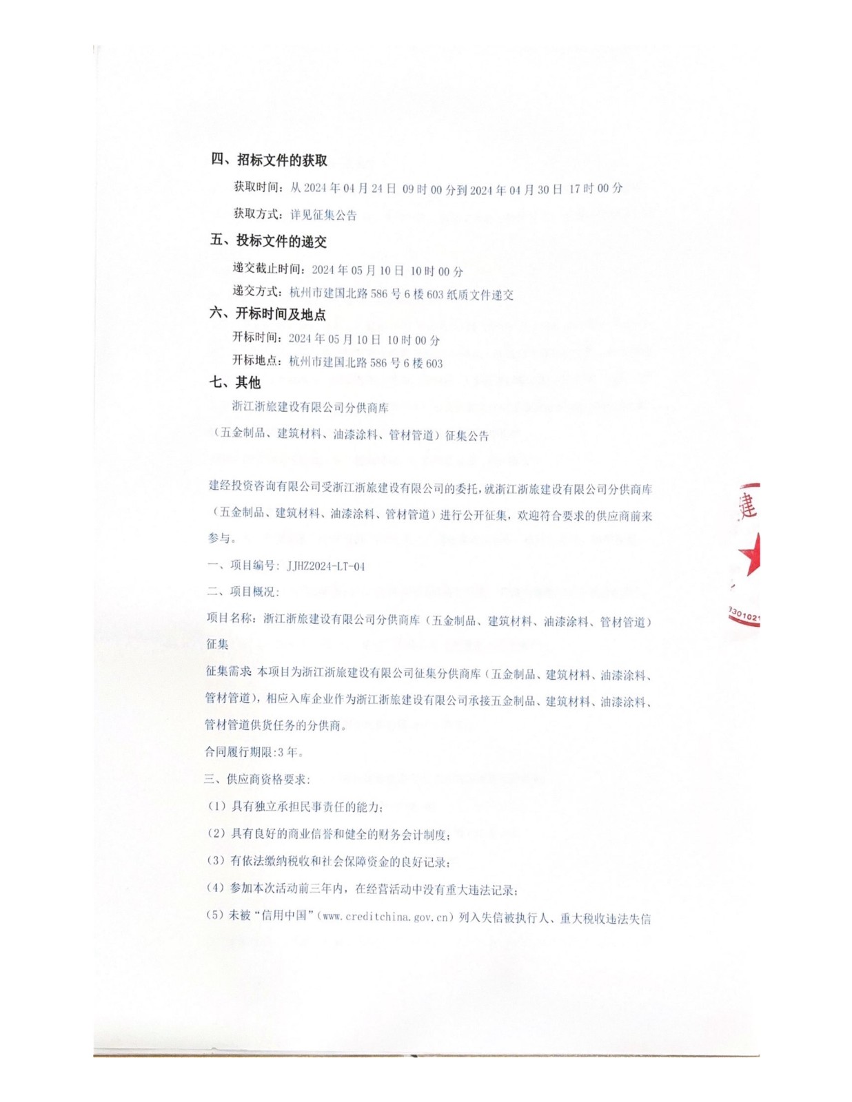 浙江浙旅建设有限公司分供商库(钢结构)征集公告