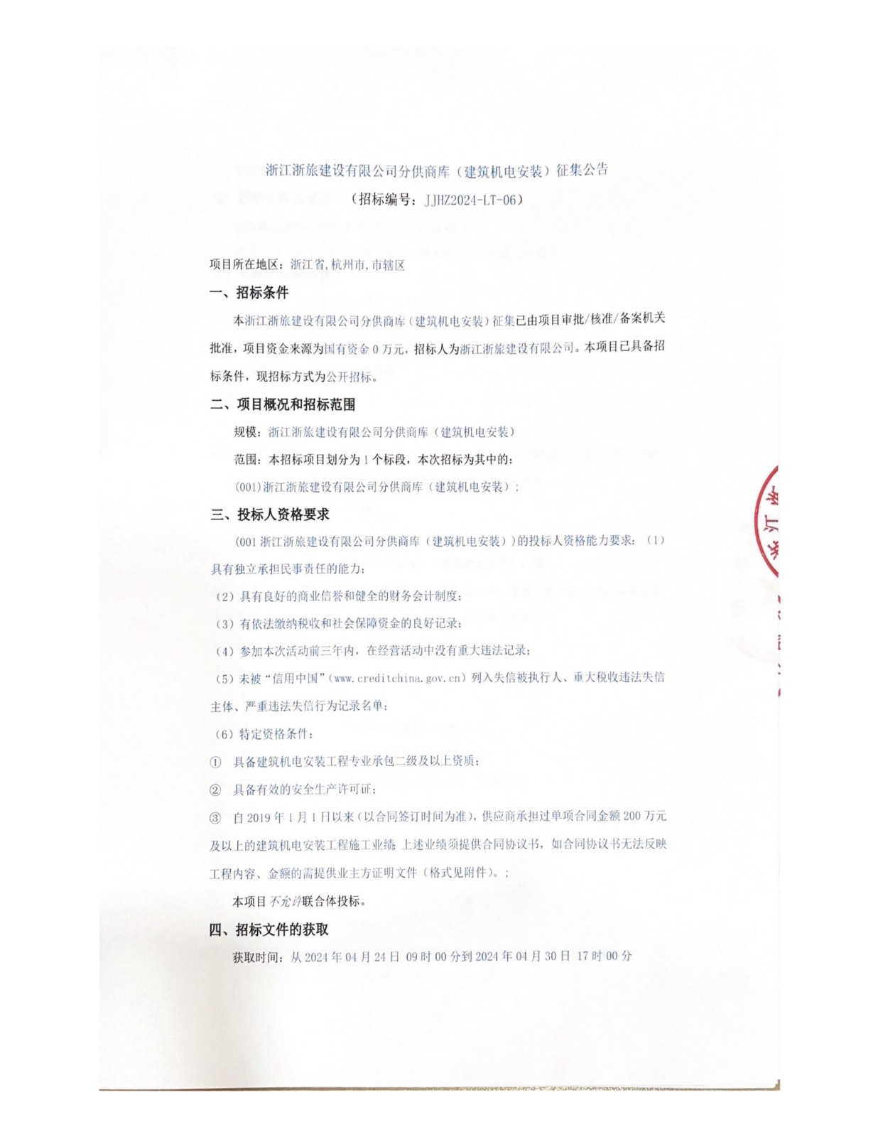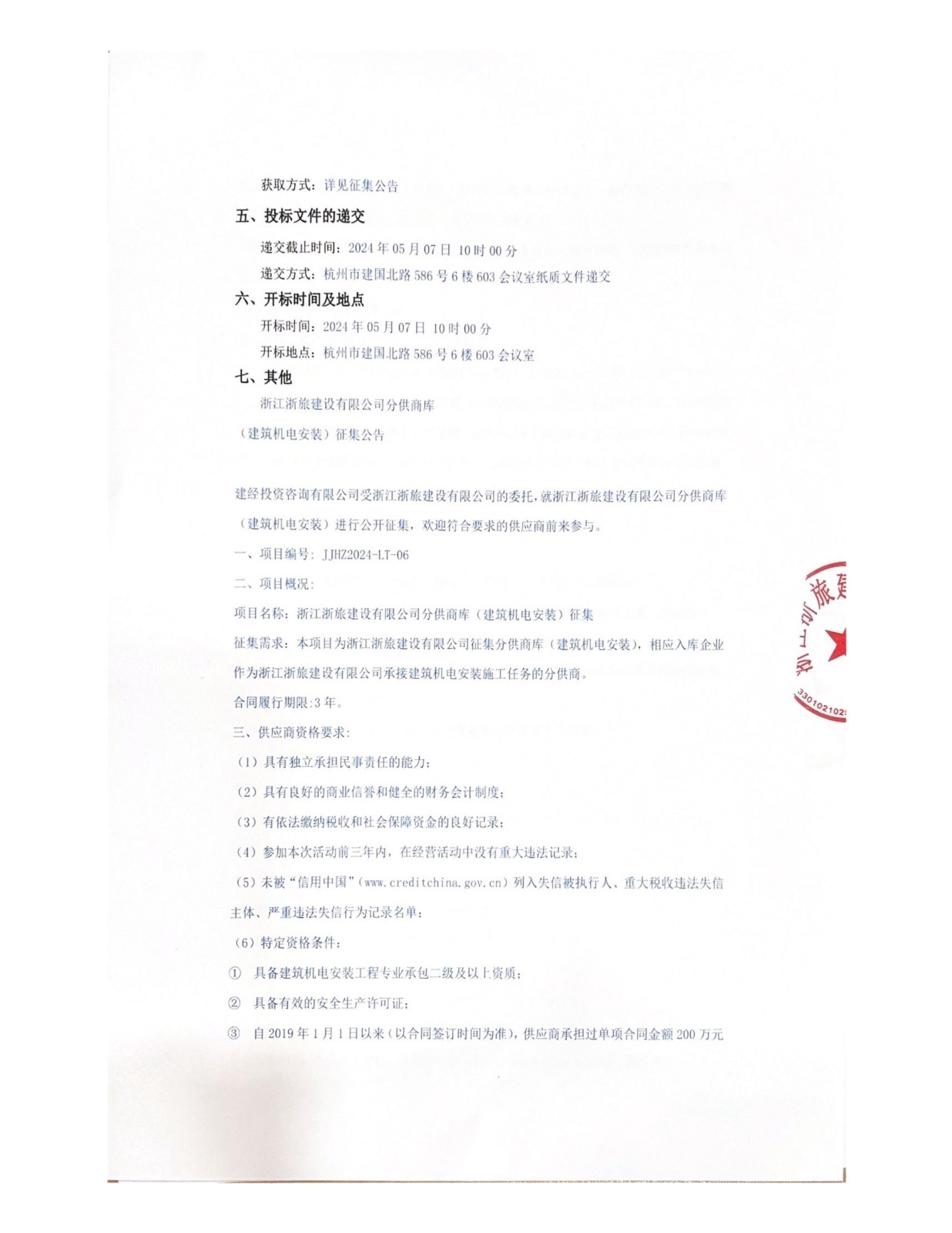 浙江浙旅建设有限公司分供商库(建筑机电安装)征集公告