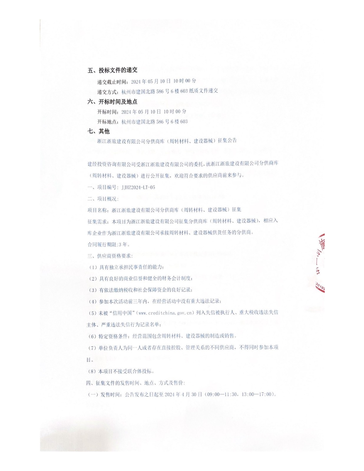 浙江浙旅建设有限公司分供商库(周转材料、建设器械)征集公告