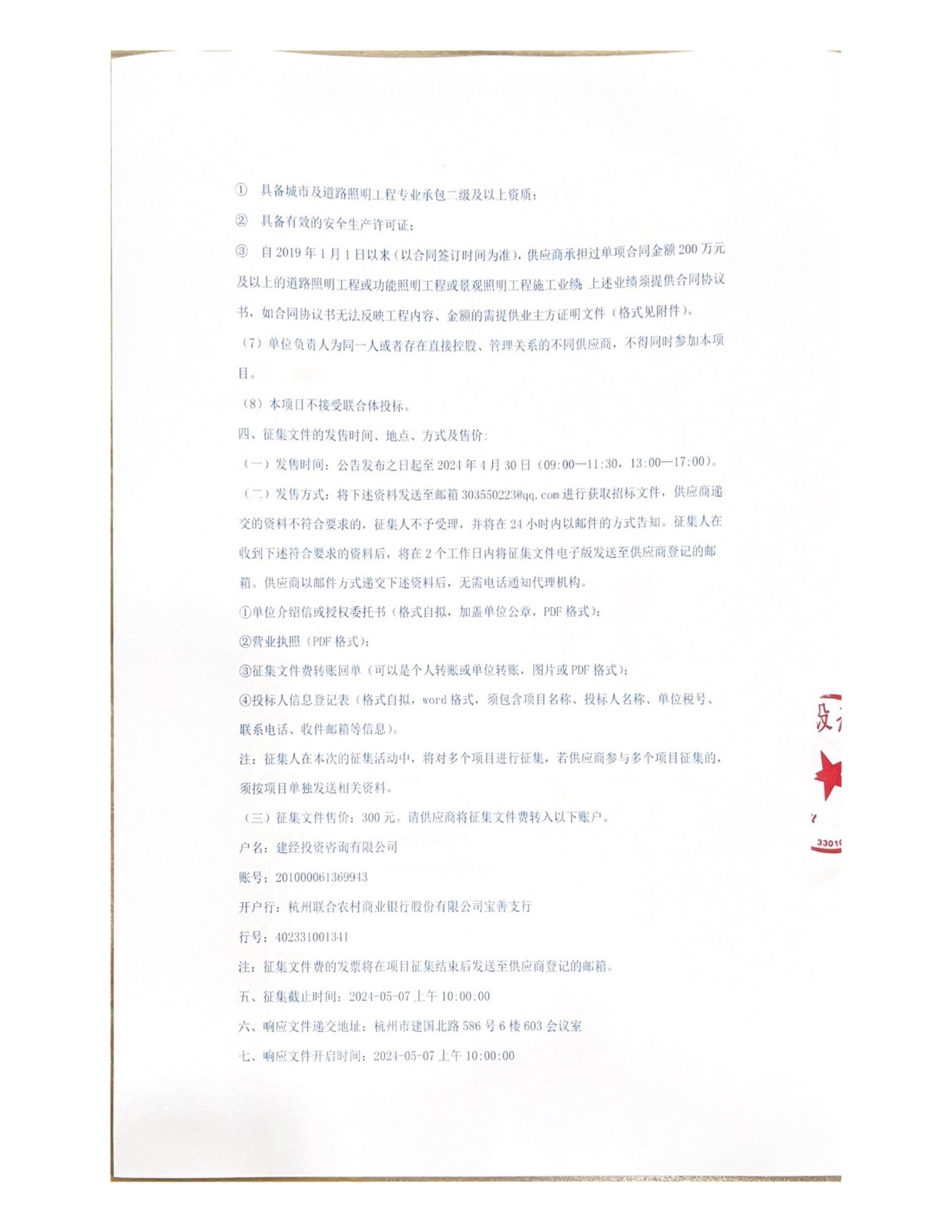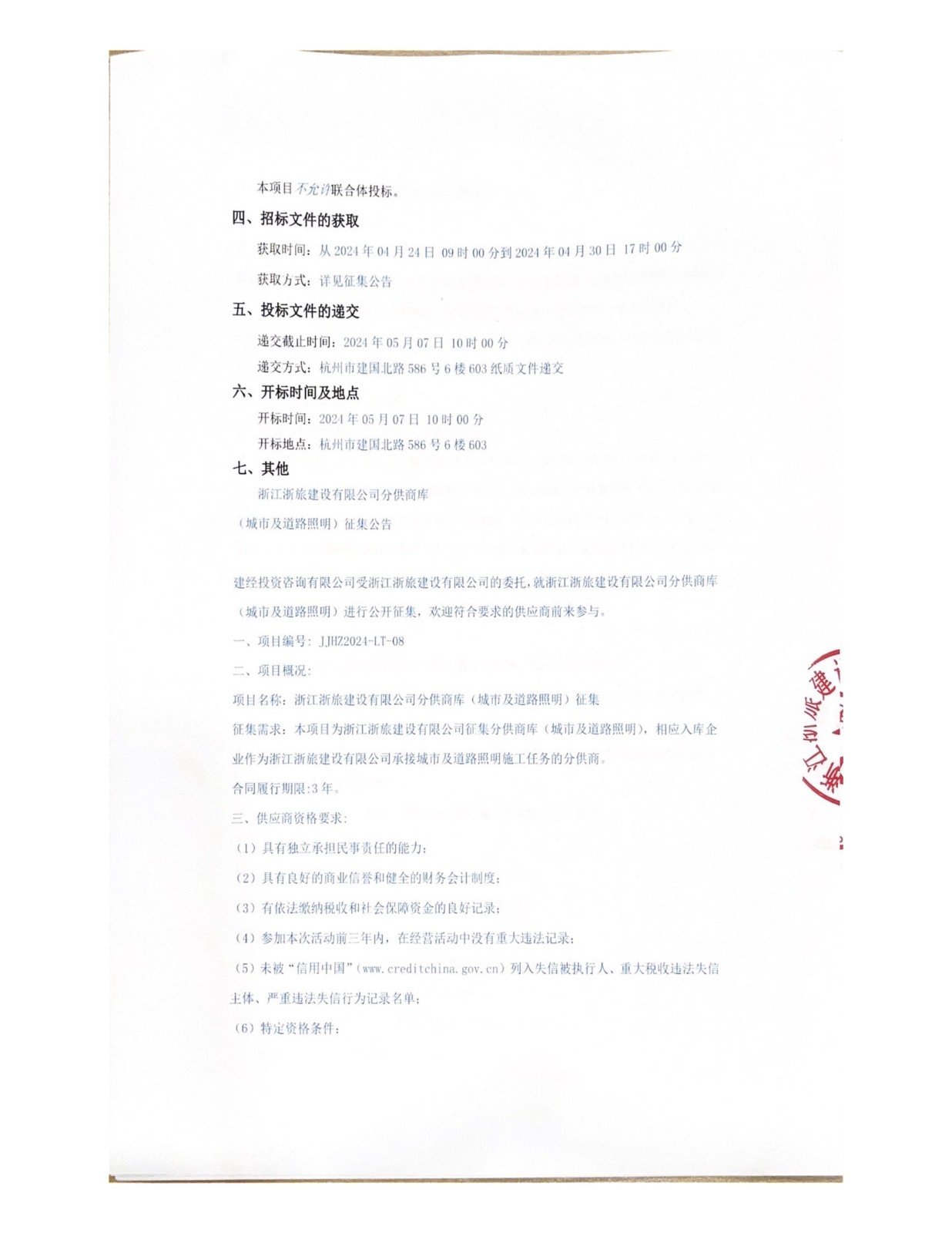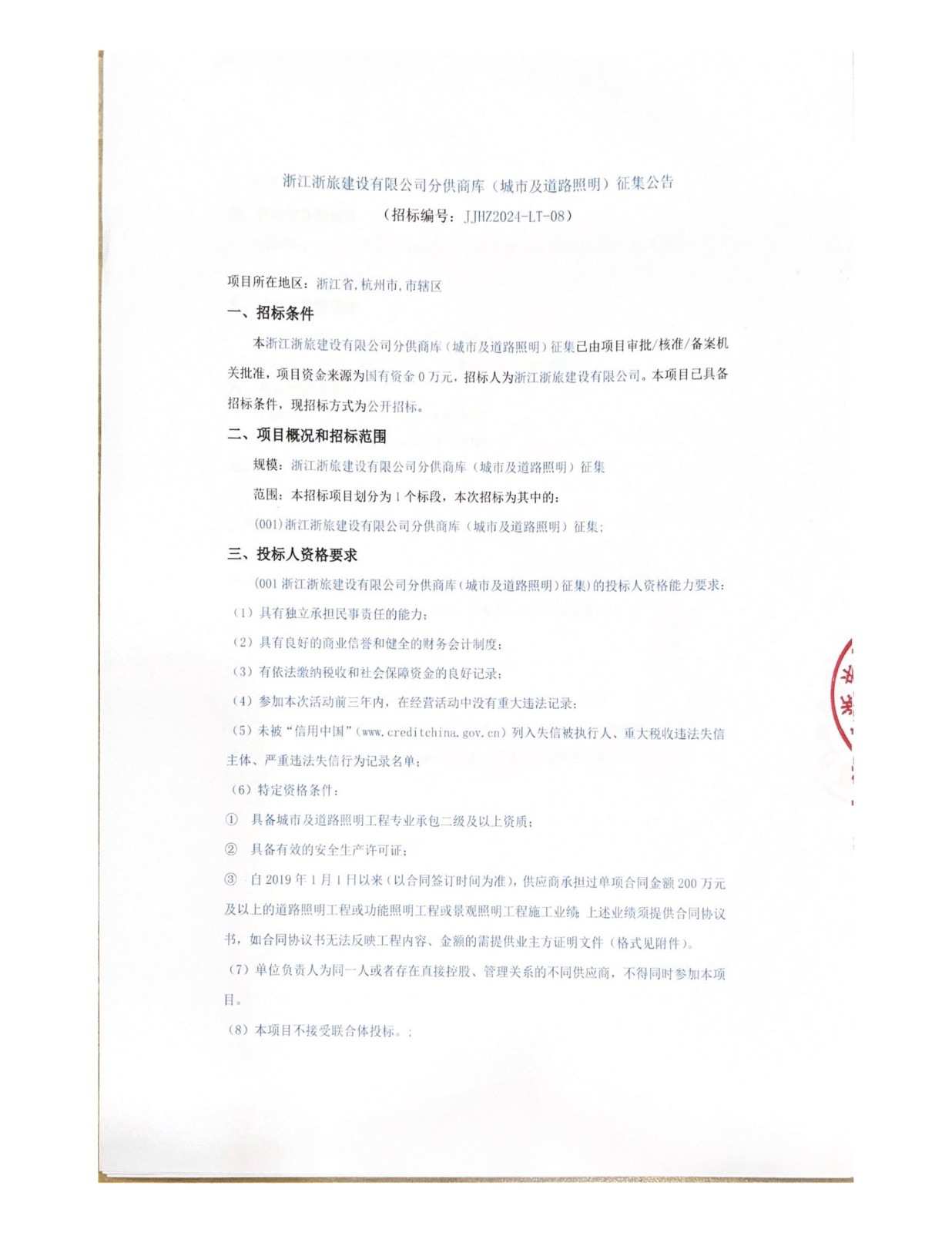浙江浙旅建设有限公司分供商库(城市及道路照明)征集公告