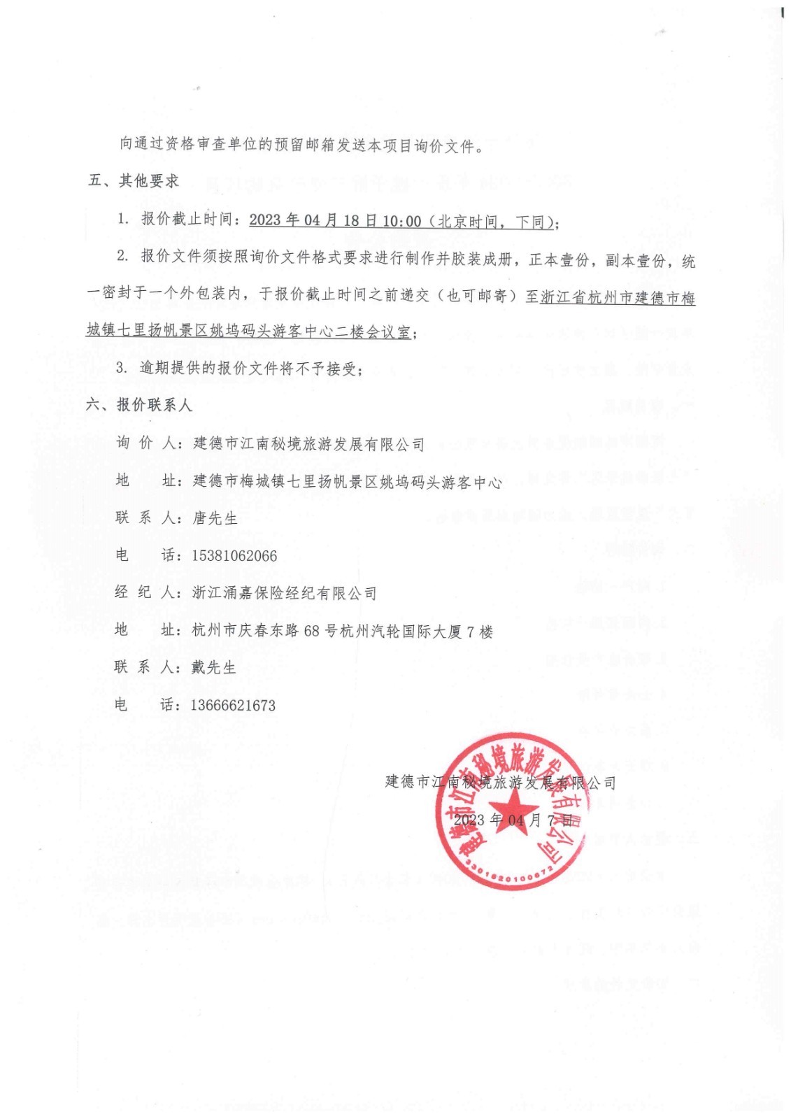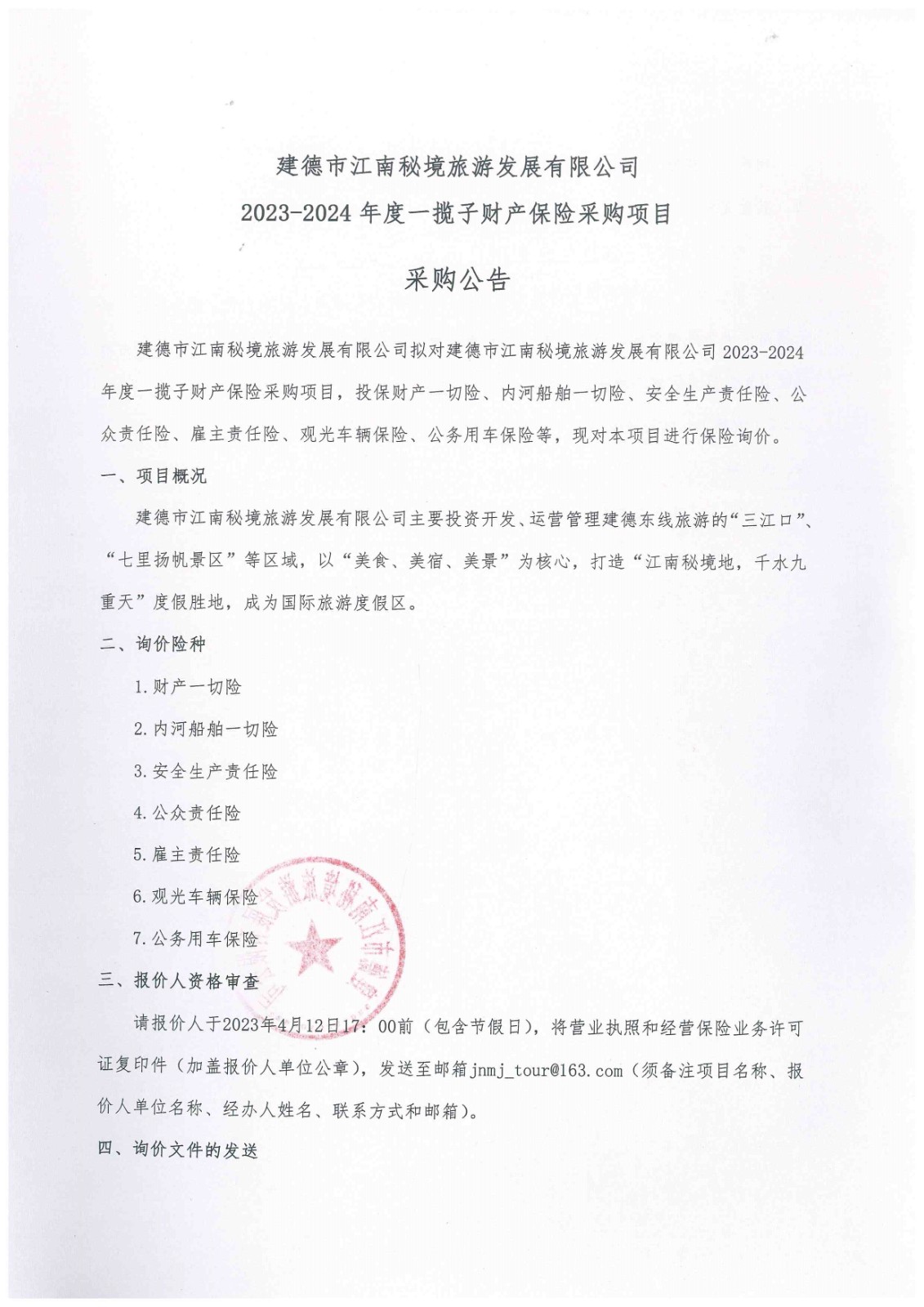建德市江南秘境旅游发展有限公司2023-2024年度一揽子财产保险采购项目采购公告