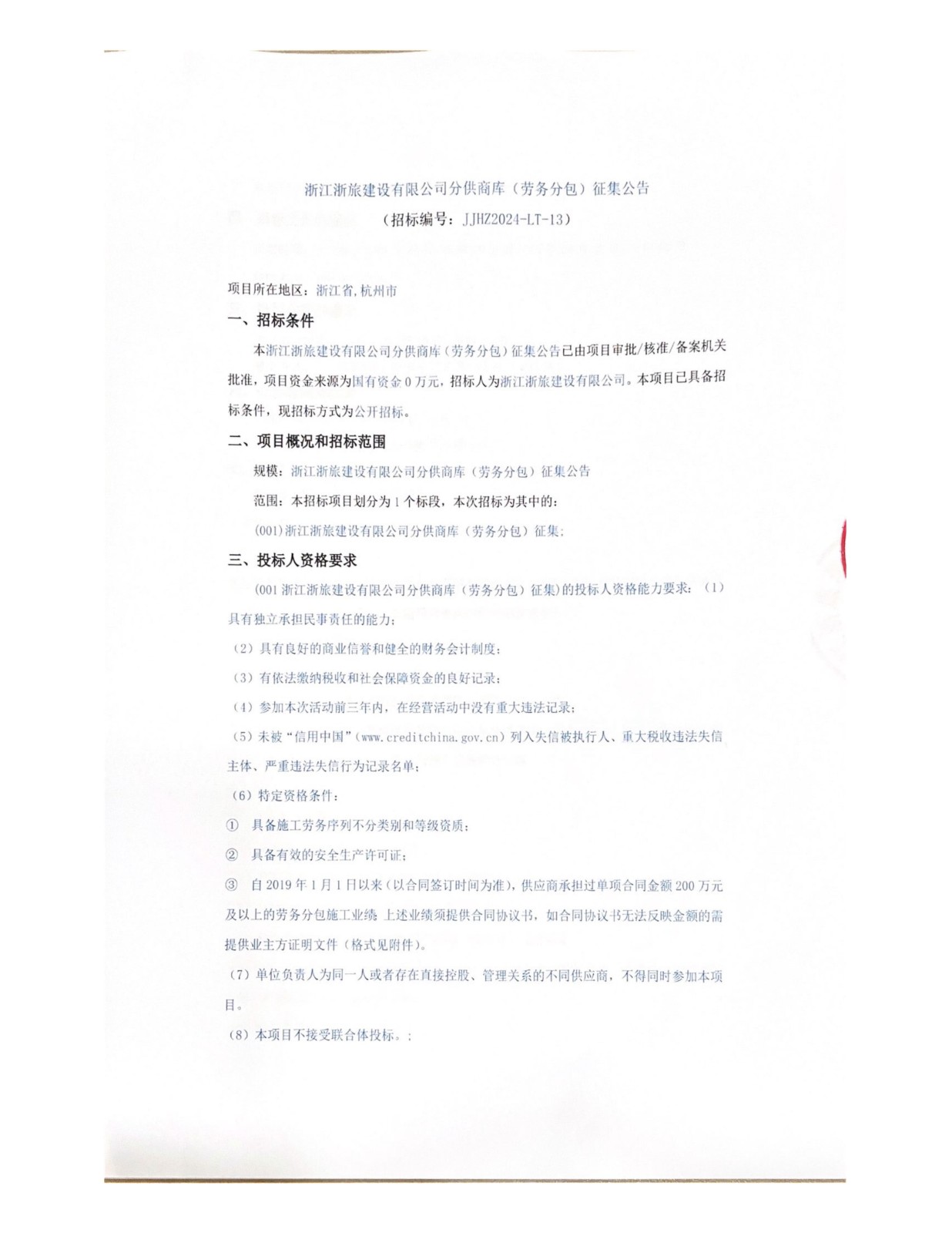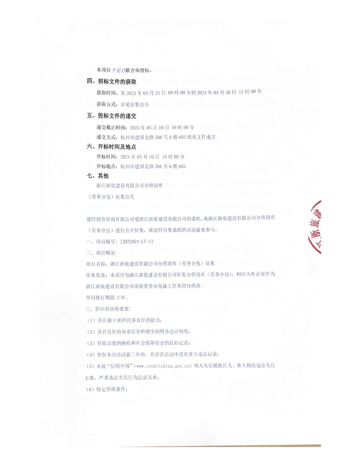 浙江浙旅建设有限公司分供商库(劳务分包)征集公告